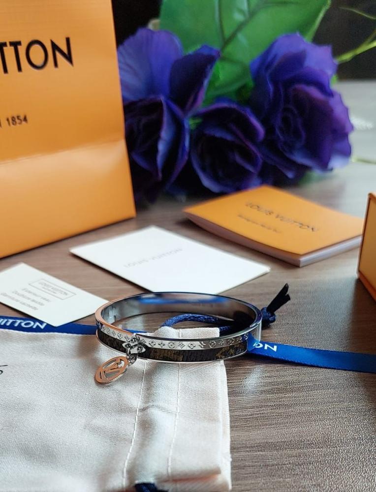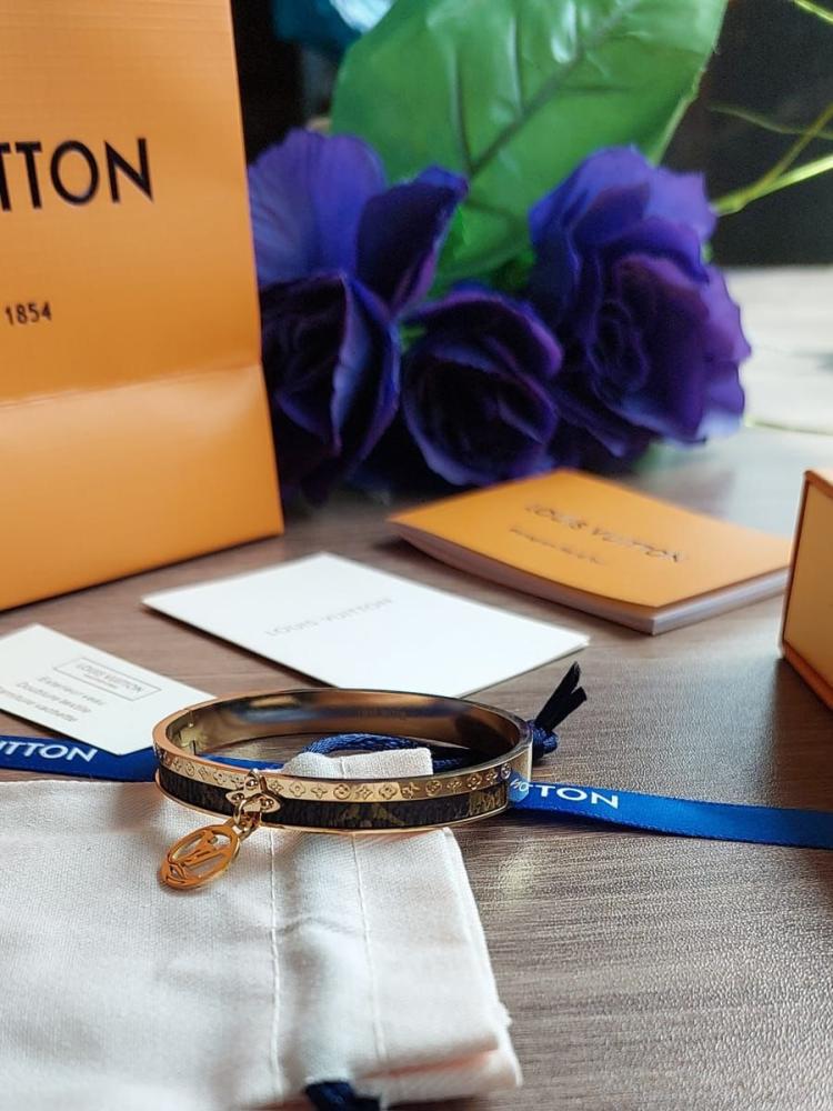 يتدلى من السوار تعليقتان مميزتان تحملان شعار لويس فويتون LV بتصميم مفرغ، مما يضيف لمسة أيقونية مميزة للقطعة. السوار مصنوع من المعدن المطلي باللون الذهبي أو الفضي عالي الجودة.